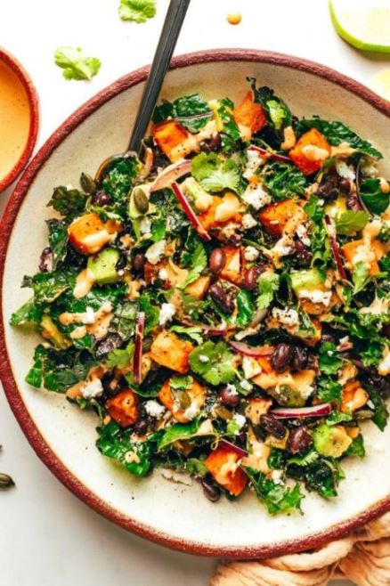 - Перемешайте и подавайте. Добавьте оставшиеся ингредиенты салата и приготовленный сладкий картофель и перемешайте до однородной массы. Подавайте немедленно, сбрызнув соусом чипотле из тахини, и наслаждайтесь!